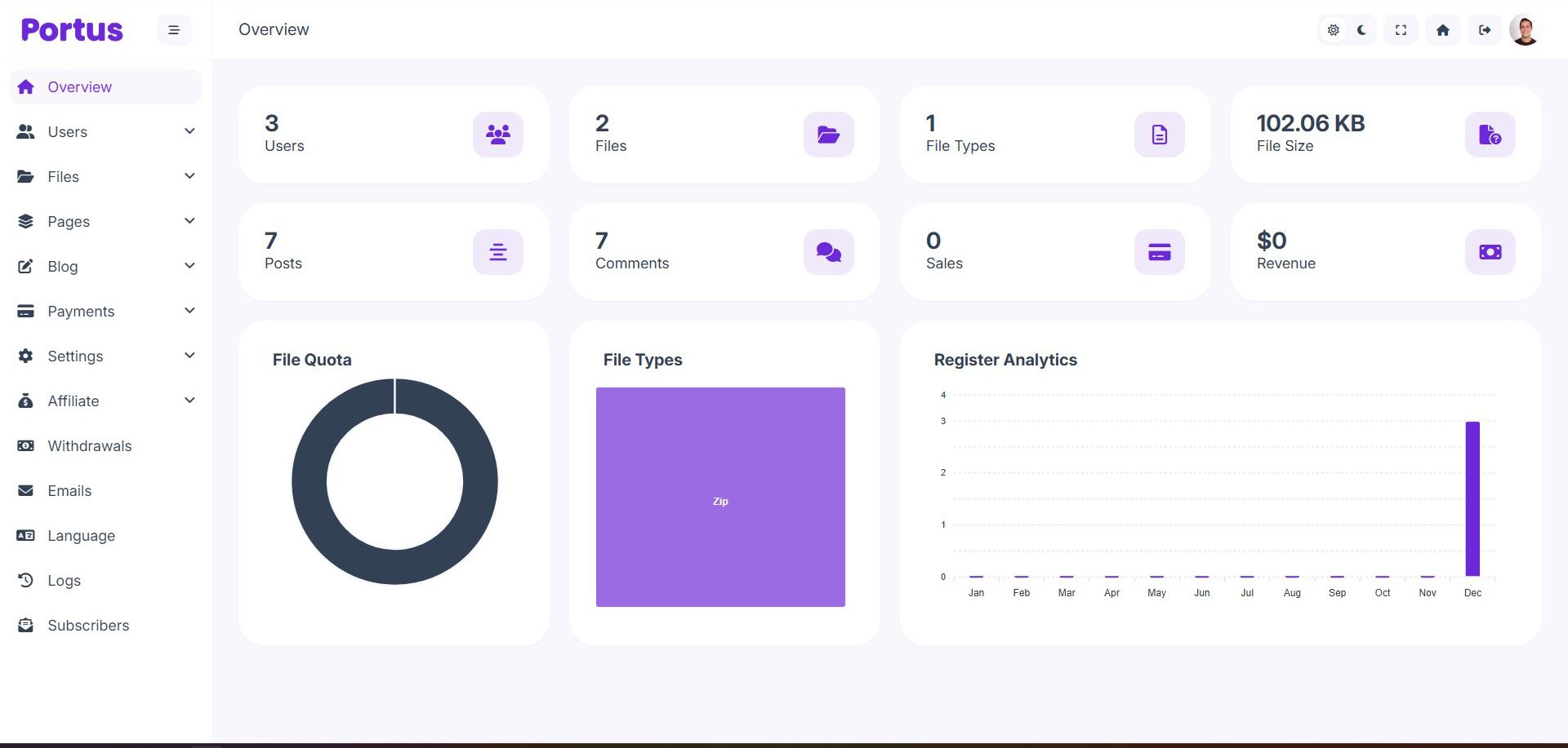 Portus is an advanced, responsive and modern script for file hosting coded with Laravel 11 and Vanilla JS. It is easily customizable with page builder and widgets. The seo settings of each page can be adjusted. All PHP codes are written in accordance with PSR standards. HTML codes have been tested in W3C validator. CSS files are created with SASS.